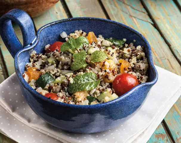 Coloque a quinoa em uma peneira de trama fina e lave bem os grãos em água corrente. Transfira para uma panela com água suficiente para cobrir os pequenos grãos. Cozinhe por 15 minutos ou até ficar macia, mas firme. Escorra muito bem e transfira para uma tigela. Em seguida, adicione os ingredientes restantes e regue com o azeite, misturando delicadamente. Sirva decorado com raminhos de hortelã.